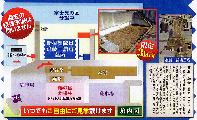 本堂裏手の墓地に新選組隊士で戊辰戦争にも参加した斎藤一諾斎のお墓があります。