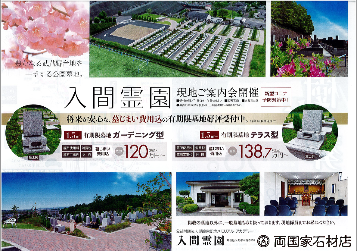平成28年6月 : 公益財団法人瑞泉院記念メモリアル・アカデミーが入間市から墓地経営許可を、埼玉県から公益法人認定を受け、解散する宗教法人瑞泉院から霊園を承継し「入間霊園」として再発足 |