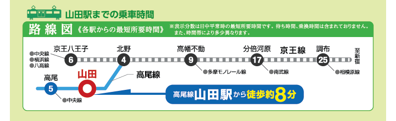 - 京王高尾線「山田駅」から徒歩8分。八王子インターから約10分